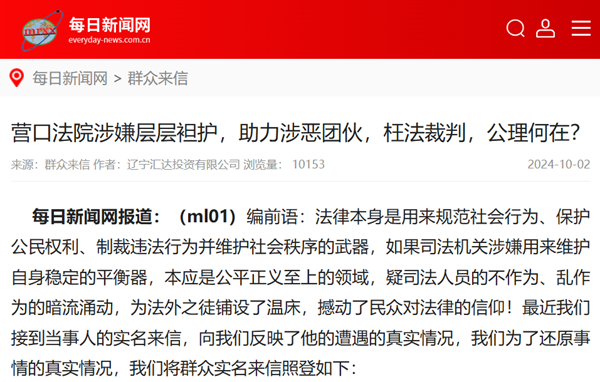 每日新闻网报道:(ml01) 编前语:法律本身是用来规范社会行为、保护公民权利、制裁违法行为并维护社会秩序的武器,如果司法机关涉嫌用来维护自身稳定的平衡器,本应是公平正义至上的领域,疑司法人员的不作为、乱作为的暗流涌动,为法外之徒铺设了温床,撼动了民众对法律的信仰!最近我们接到当事人的实名来信,向我们反映了他的遭遇的真实情况,我们为了还原事情的真实情况,我们将群众实名来信照登如下: