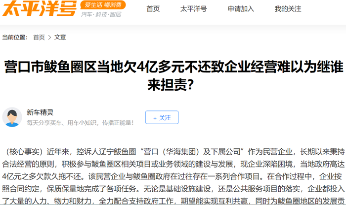 (核心事实)近年来,控诉人辽宁鲅鱼圈“营口(华海集团)及下属公司”作为民营企业,长期以来秉持合法经营的原则,积极参与鲅鱼圈区相关项目或业务领域的建设与发展,现企业深陷困境,当地政府高达4亿元之多欠款久拖不还。该民营企业与鲅鱼圈政府在过往存在一系列合作项目。在合作过程中,企业按照合同约定,保质保量地完成了各项任务。无论是基础设施建设,还是公共服务项目的落实,企业都投入了大量的人力、物力和财力,全力配合支持政府工作,期望能实现互利共赢,同时为鲅鱼圈地区的发展贡献力量。