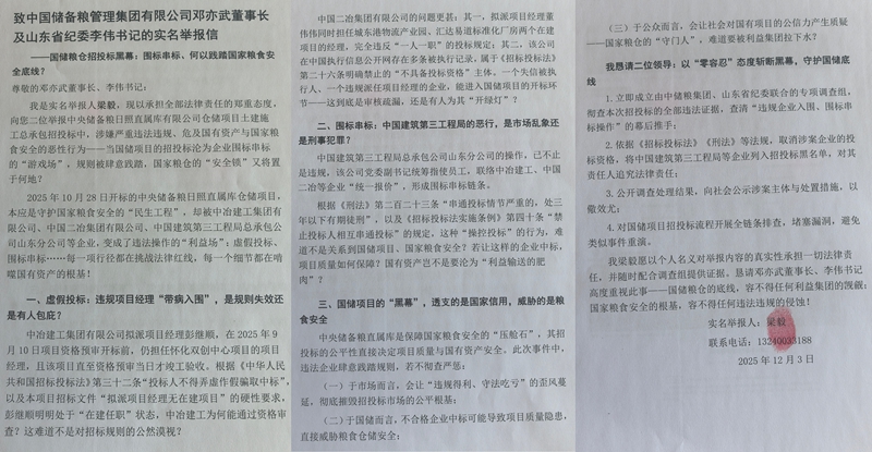 我是实名举报人梁毅,现以承担全部法律责任的郑重态度,向您二位举报中央储备粮日照直属库有限公司仓储项目土建施工总承包招投标中,涉嫌严重违法违规、危及国有资产与国家粮食安全的恶性行为。当国储项目的招投标沦为企业围标串标的“游戏场”,规则被肆意践踏,国家粮仓的“安全锁”又将置于何地?