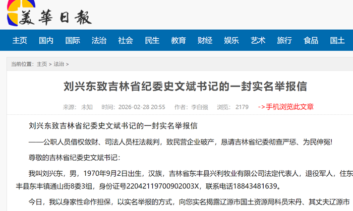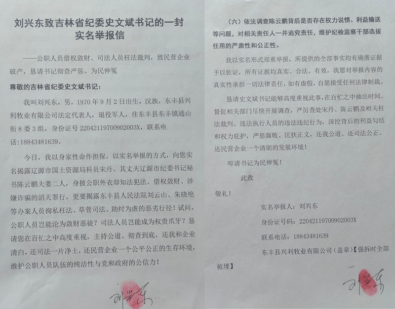 刘兴东致吉林省纪委史文斌书记的一封实名举报信 公职人员借权敛财、司法人员枉法裁判,致...