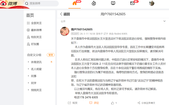 在本人前往汇报反映问题之前,中院在已进行正常安检的情况下,盘锦市中级法院院长王兴奎于2026-2-11在无任何法律手续的情况下仍强行要求女工作人员对本人进行全身各个方位搜身检查,且在十余位法院干警在场围观的情形下实施。