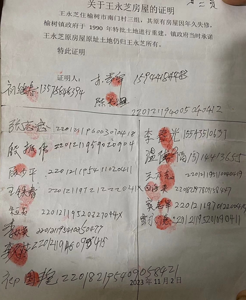 在南门村三组,记者跟随王永林来到他家的原有宅基地,一眼望去,这块宅基地不大,也只有一亩多大,早已经变成了耕地。记者随机采访了几位村民,村民们向记者证实:王永芝原有的房屋是1990年重建的,当时因为房子处于低洼地被水侵泡,成了危房,镇政府决定,特批给他一块宅基地,让他异地重建,并承诺原有的宅基地作为机动地仍归王永芝所有。王永芝搬离后,邻居时(音)姓人家就将此处宅基地种上庄稼,后来就租给了村里会计、队长吴老七(吴万福)。这期间,王永芝和父母相继离世,王永芝的本家弟弟王永林就开始找时(音)姓人家索要老宅的宅基地,但至今未果。采访中,一些村民还写了证明材料并在证明材料上签字、按上手印。