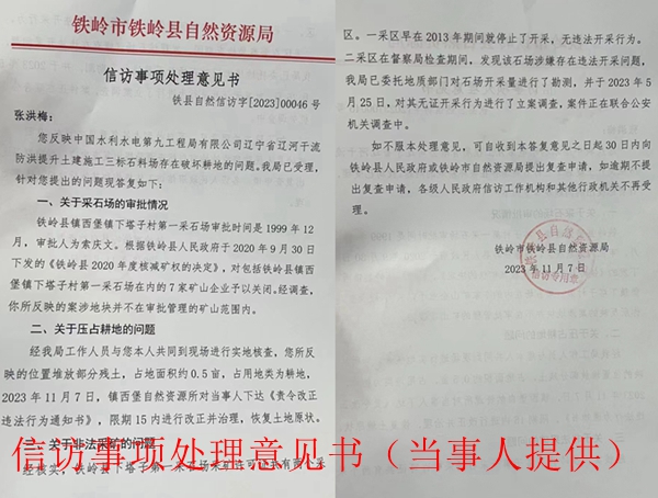 张景林等人认为,张忠海是挂靠在第九工程局的名下,从事非法采矿活动的,严重破坏了耕地,于是不断向有关部门举报。铁岭市铁岭县自然资源局经过调查,做出了《信访事项处理意见书》(铁县自然信访字[2023]00046号)。该意见书称: