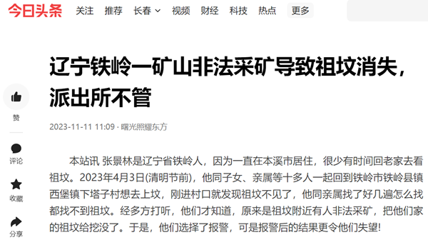 本站讯 张景林是辽宁省铁岭人,因为一直在本溪市居住,很少有时间回老家去看祖坟。2023年4月3日(清明节前),他同子女、亲属等十多人一起回到铁岭市铁岭县镇西堡镇下塔子村想去上坟,刚进村口就发现祖坟不见了,他同亲属找了好几遍怎么找都找不到祖坟。经多方打听,他们才知道,原来是祖坟附近有人非法采矿,把他们家的祖坟给挖没了。于是,他们选择了报警,可是报警后的结果更令他们失望!