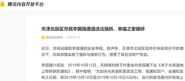 近日,本网站接到李国强的实名举报。其声称,天津市北辰区政府在未获其许可的情况下,对其房屋实施了强拆与偷拆行为,损害了其合法财产权益。