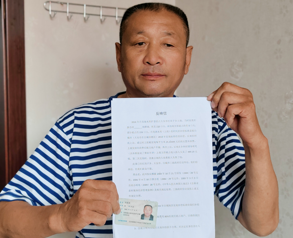 图为:大安市红岗子乡新合村一组农民刘忠林手持《反映信》他有话要说。