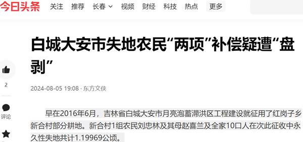 早在2016年6月,吉林省白城大安市月亮泡蓄滞洪区工程建设就征用了红岗子乡新合村部分耕地。新合村1组农民刘忠林及其母赵喜兰及全家10口人在次此征收中永久性失地共计1.19969公顷。