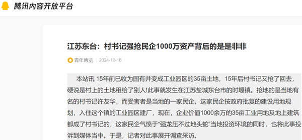 本站讯 15年前已收为国有并变成工业园区的35亩土地,15年后村书记又抢了回去,硬说是村上的土地租给了别人!此事就发生在江苏盐城东台市的时堰镇。抢地的是当地有名的村书记许友华,而受害者是当地的一家民企。这家民企按政府批复的建设用地规划,入住这个镇的工业园区建厂,现在,企业价值1000余万的35亩工业用地及地上建筑都成了村书记的,这家民企气愤于“强龙压不过地头蛇”当地投资环境的同时,也将此事投诉到媒体当中。于是,记者对此事展开调查采访。