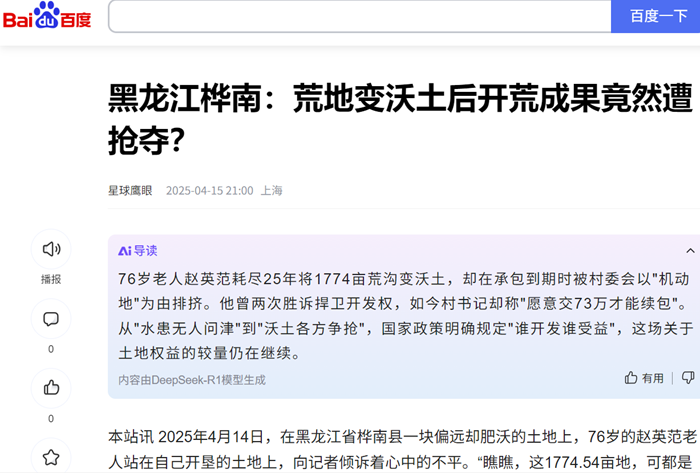 本站讯 2025年4月15日,多家网络媒体曾经以《黑龙江桦南:荒地变沃土后开荒成果竟然遭抢夺...