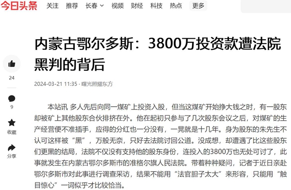 本站讯 多人先后向同一煤矿上投资入股,但当这煤矿开始挣大钱之时,有一股东却被矿上其他股东合伙排挤在外。他在起初只参与了几次股东会议之后,对煤矿的生产经营便不准插手,应得的分红也一分没有,一晃就是十几年。身为股东的朱先生不认可这样被“黑”,万般无奈,只好去法院讨回公道。没成想,却遭遇了比这些股东们更黑的结局,法院不仅没有支持他的股东身份,连投入的3800万也无处可讨了,此事就发生在内蒙古鄂尔多斯市的准格尔旗人民法院。带着种种疑问,记者于近日亲赴鄂尔多斯市对此事进行调查采访,结果不能用“法官胆子太大”来形容,只能用“触目惊心”一词似乎才比较恰当。