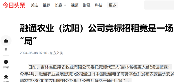日前,吉林省欣翔农牧业有限公司委托竞标代理人(吉林省德惠人)邹海波披露:今年4月,融通农业发展(沈阳)公司通过《中国融通电子商务平台》发布农安县永安乡隋家屯33000亩农用地对外招租《公告》竟然一场闹“剧”。