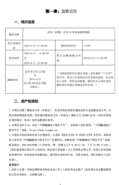 据吉林省欣翔农牧业有限公司委托参与竞标代理人邹海波提供的“农发(沈阳)公司24年农业租赁项目”公告载明:本项目设置了最低成交价(年租金),若竟价场次结束后最高出价未达到最低成交价,该场次将按照流拍处理。供应商在最低成交价(年租金)基础上以10000元/次(具体详见项目项目概况一览表)加价金额进行竞价。本项目竟价方式:依托“中国融通电子商务平台”,采取网上竟价招租。“中国融通电子商务平台"网址:https://www.ronghw.cn。本项目各包段意向承租人注册报名:本项目《竟价公告》和《竟价文件》发布后,意向承租人即可在“中国融通电子商务平台"注册报名。详情咨询“中国融通电子商务平台"客服。联系电话:400-189-8880(工作时间:周一至周五上午8:30-11:30,下午13:00-17:00)