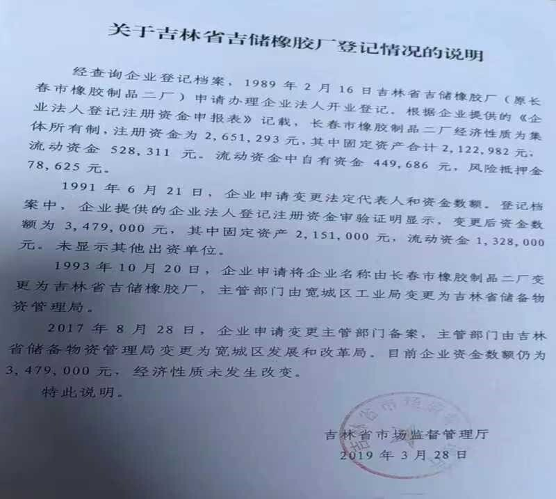 记者从橡胶厂职工们处看到一份省市场监督管理厅于2019年3月28日出具的《关于吉林省吉储橡胶厂登记情况的说明》。该说明称:“经查询企业登记档案,确认了企业的经济性质为集体所有制。登记档案中,企业提供的企业法人登记注册资金审验证明显示,变更后资金数额为3,479,000元,其中固定资产2,151,000元,流动资金1,328,000元。未显示其他出资单位。