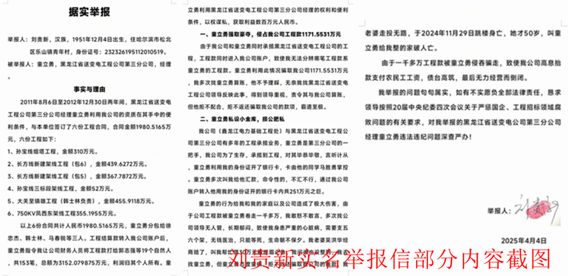 刘贵新在举报信中称:在2011年8月6日至2012年12月30日间,黑龙江省送变电工程公司第三分公司经理童立勇利用手中职权,借助刘贵新公司(鑫龙江电力基础工程处)资质与本单位送变电公司签订6份工程合同,合同金额总计1980.5165万元,但是童力勇没把签的合同给刘贵新,对于钱数刘贵新并不掌握。工程结算款到账后,童立勇就说款是他的,叫刘贵新把款转给童力勇提供的19个自然人,银行卡号和人名都是童力勇提供的。童指令财务人员将3152.079875万元工程款打给19个自然人,刘贵新对这些人根本就不认识,这些人的钱最后都到了童力勇的手里,按法律规定这已经涉嫌诈骗。