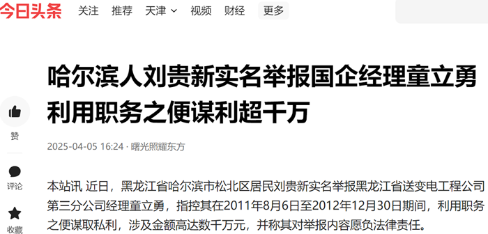 本站讯 近日,黑龙江省哈尔滨市松北区居民刘贵新实名举报黑龙江省送变电工程公司第三分公司经理童立勇,指控其在2011年8月6日至2012年12月30日期间,利用职务之便谋取私利,涉及金额高达数千万元,并称其对举报内容愿负法律责任。