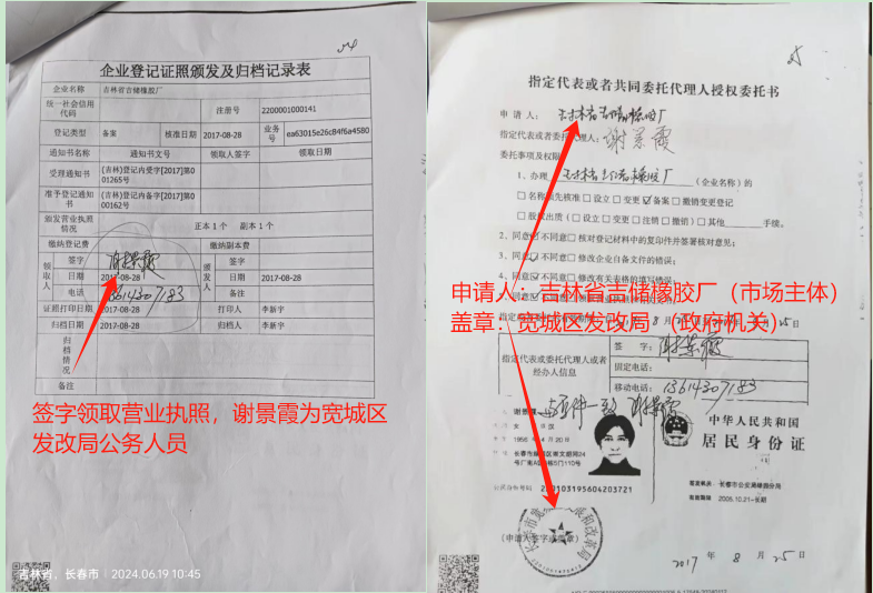 5.吉储橡胶厂营业执照在2005年已经吊销。吉林省市场监管厅2017年8月28日再次颁发并由宽城区发改局授权的指定代理人谢景霞(宽城区发改局公务人员)领取新的吉林省吉储橡胶厂营业执照,严重违反了《中华人民共和国企业登记管理条例》规定。