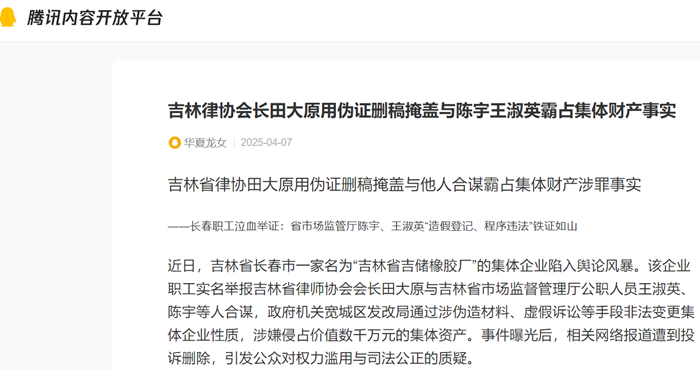 近日,吉林省长春市一家名为“吉林省吉储橡胶厂”的集体企业陷入舆论风暴。该企业职工实名举报吉林省律师协会会长田大原与吉林省市场监督管理厅公职人员王淑英、陈宇等人合谋,政府机关宽城区发改局通过涉伪造材料、虚假诉讼等手段非法变更集体企业性质,涉嫌侵占价值数千万元的集体资产。事件曝光后,相关网络报道遭到投诉删除,引发公众对权力滥用与司法公正的质疑。
