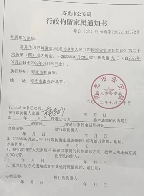 2020年,常秀华写信给寿光市委书记林红玉反映情况,林书记批示督促建设局(现在的住建局)快速办理,并将信件转发给原建设局长崔维川。然而,常秀华多次找崔维川,他却东躲西藏,欺上瞒下,新官不理旧账,导致问题久拖不办。走投无路的常秀华只好于2022年7月19日逐级上访到北京国家信访局。之后,寿光信访局副局长侯淑华长期驻京拦访、截访。寿光市信访局局长韩高贵、住建局副局长彭江波等人将她诓骗出来后,有寿光市公安局车辆和公安人员10多人强行将常秀华拖入车内并没收其手机,限制人身自由,将其从北京带到寿光市公安局治安科,24小时连夜逼问,以涉嫌“非访”定罪,将她行政拘留九日。两个月后,常秀华又因寿光市鼎信房产交易有限公司借款合同纠纷(此前已和解),被以妨碍民事诉讼为由再次行政拘留十五日并被罚款60000元。此后,寿光市相关部门还对常秀华的家人进行监控,在其车底下多次安装定位仪,侵犯其家庭及个人隐私。