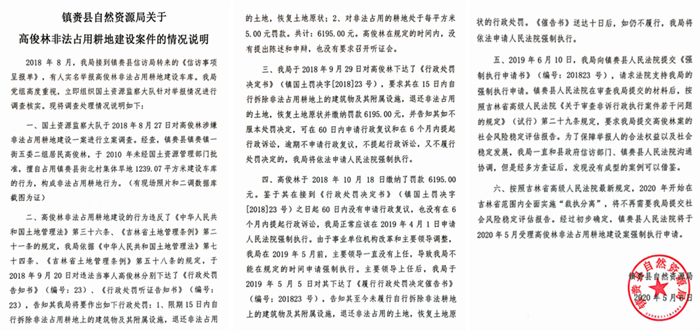 实名举报高俊林的是一个叫郝亚洲的人。郝亚洲在举报信里称:2010年未,高俊林未经国土资源管理部门批准,擅自占用镇赉县街北村集体耕地1239.07平方米建设车库,所建车库及其他用房设施最晚于2016年6月出售完毕。其占用的耕地内就有我的9眼水源井,高俊林于2016年2月份盗窃其井内设施,买通镇赉县公安局副局长郑伟,刑警队杨明和周兴,公安部门未对其立案侦查,他更加嚣张,之后就在井上盖车库出售。于是,郝亚洲2018年6月将此事反映到镇赉县自然资源局,但是由于镇赉县自然资源局法规监察科科长胡晓强出具的材料中申请执行的行为主体不够全面,没有确定已售出车库的所有人,法院未支持其强制执行的行政行为,镇赉县法院第一次裁定不予强制执行。胡晓强故意包庇高俊林,明知主体人员不全面还要故意申请法院强制执行,导致申请被驳回。在接到法院裁决后,胡晓强不改正其行政行为,反而提出复议,申请白城市中级法院裁定,结果是2020年7月28日中级法院作出的裁定书(2020)吉08行审复2号再次驳回复议申请,维持原裁定。