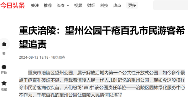 一位打拳的市民李某(化名)说道:"我们其实只是千千万万个涪陵市民的缩影,在我们眼里,望州公园被该单位不负责任的管理成如今这般不堪入目之模样,该单位负责人难辞其咎。他对不起涪陵人民对望州公园的厚爱对该单位的信任,面对千疮百孔脏乱差松懒散的管理现状,望州公园管理办公室形同虚设,该单位主要负责人严重失职"。