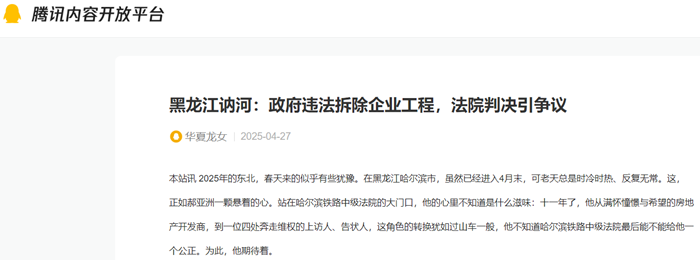 日前,嘉缘公司已向哈尔滨铁路中级法院提起上诉,并向纪检监察部门提交了关于一审法院疑似“枉法裁判”的举报材料。4月30日,哈尔滨铁路中级法院将开庭审理。而据郝亚洲介绍,由于拉哈镇政府不讲诚信并单方面违法违约,导致严重的后果,曾经在工地干活的农民工拿不到工资,给郝亚洲供料的拿不到材料款,郝已经被多人起诉,有的已经进入执行程序。本案的最终走向,不仅关乎一家企业的生存,更考验着基层治理能否真正步入法治化轨道。对此,媒体将继续关注。