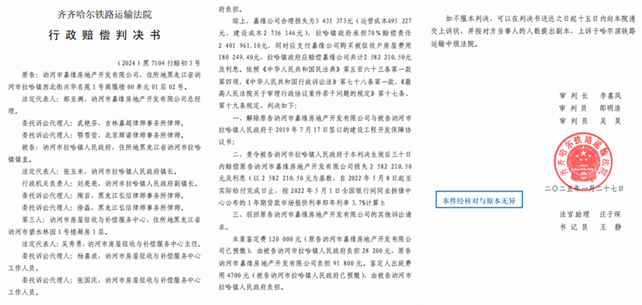 然而,在随后的行政赔偿诉讼中,司法裁判出现争议。2024年,齐齐哈尔铁路运输法院作出(2024)黑7104行赔初3号判决,认定“双方均存在违法违约行为”,判决嘉缘公司承担30%责任,镇政府承担70%责任,并将鉴定机构评估的870余万元损失仅支持258万元。