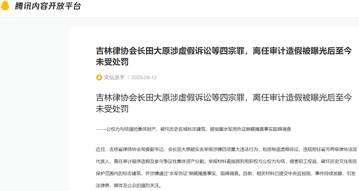 近日,吉林省律师协会党委副书记、会长田大原被实名举报涉嫌四项重大违法行为,包括制造虚假诉讼、违规担任省市两级律协法定代表人、离任审计程序造假及参与争议性集体资产分割。举报材料直指其利用职权与公权力勾结,侵害职工权益、破坏历史文化街区保护范围内的标志建筑,并涉嫌通过“水军伪证”删稿掩盖事实、阻碍调查。目前,相关材料已提交中央巡视组,事件持续发酵,引发法律界、媒体及公众的强烈关注。
