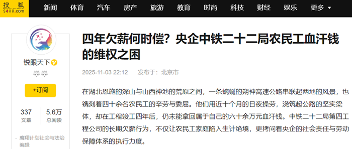 从社会责任来看,央企肩负着维护社会公平正义、保障民生的重要使命。国务院与国资委曾多次发文,要求中央企业带头解决拖欠农民工工资问题,对恶意欠薪行为保持“零容忍”。近年来,国家更是建立了工资支付监控预警平台、农民工工资保证金制度等一系列保障机制,目的就是让农民工劳有所得。但中铁二十二局第四工程公司却让这些制度形同虚设,以“财务流程”为借口拖延支付,以“请示领导”为由敷衍塞责,本质上是对农民工劳动价值的漠视,对社会责任的推卸。四十余名农民工的背后,是四十多个家庭的生计,央企的失信行为,不仅让这些家庭陷入困境,更损害了中央企业在公众心中的公信力,影响了社会的和谐稳定。