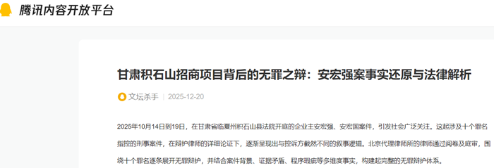 2025年10月14日到19日,在甘肃省临夏州积石山县法院开庭的企业主安宏强、安宏国案件,引发社会广泛关注。这起涉及十个罪名指控的刑事案件,在辩护律师的详细论证下,逐渐呈现出与控诉方截然不同的叙事逻辑。北京代理律师所的律师通过阅卷及庭审,围绕十个罪名逐条展开无罪辩护,并结合案件背景、证据矛盾、程序瑕疵等多维度事实,构建起完整的无罪辩护体系。