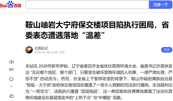 本站讯 2026年新年伊始,辽宁省委召开全省优化营商环境大会,省委书记许昆林发出 “无论哪个地区、哪个部门,只要发生破坏营商环境的人和事,一律严肃处理、严惩不贷” 的动员令。然而,在全省上下誓师攻坚的背景下,鞍山市岫岩满族自治县 “贺临・大宁府”政府保交楼项目却遭遇了一场令人费解的司法执行僵局。生效裁判沦为 “一纸空文”,法院执行遭遇 “层层拖延”,这一典型案例赤裸裸地暴露了法治化营商环境建设在基层落实中的“上热下冷” 与“中梗阻” 现象。