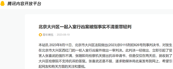 本站讯 2023年8月11日,北京市大兴区法院做出(2023)京0115刑初826号刑事判决书,对发生在北京市大兴区西红门的一桩入室行凶案件做出一审判决。此判决一经做出,立即引起了受害人张喜武的强烈不满,张随即向检察机关提出抗诉申请书,但是仅仅在两天后,就收到了大兴区检察院不支持抗诉的答复。张喜武还是不服,遂求助媒体将此案发布到网上,希望引起网友和有关方面的关注和重视。