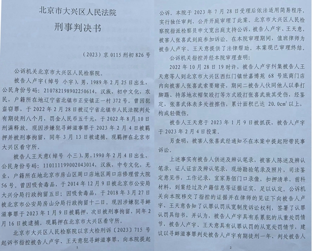 对于此案,张喜武提供的大兴区法院(2023)京0115刑初826号刑事判决书是这样认定的: