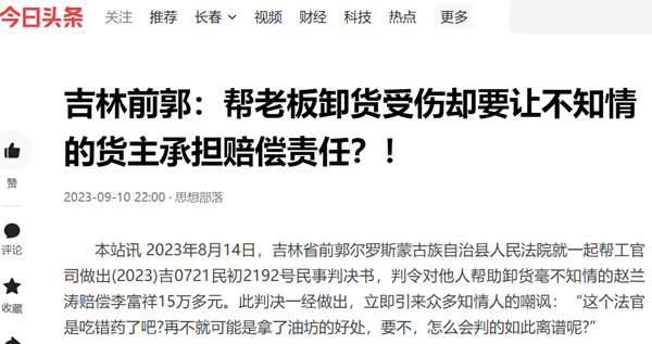 本站讯 2023年8月14日,吉林省前郭尔罗斯蒙古族自治县人民法院就一起帮工官司做出(2023)吉0721民初2192号民事判决书,判令对他人帮助卸货毫不知情的赵兰涛赔偿李富祥15万多元。此判决一经做出,立即引来众多知情人的嘲讽:“这个法官是吃错药了吧?再不就可能是拿了油坊的好处,要不,怎么会判的如此离谱呢?”