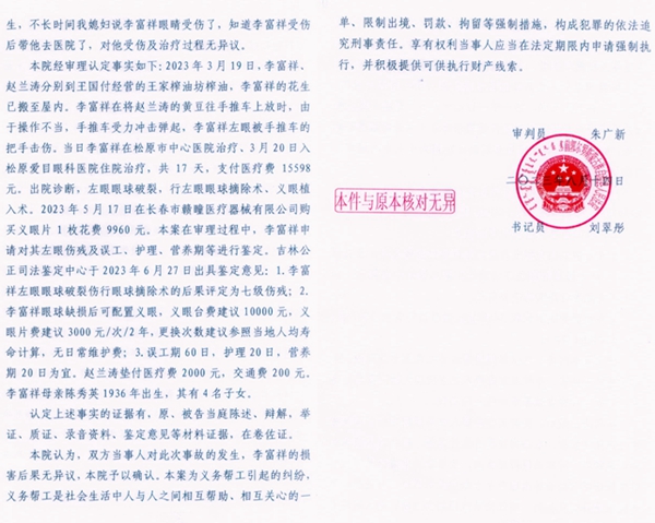 但是,法院在事实认定上却出现了截然相反的情况。判决书称,本院经审理认定事实如下:2023年3月19日,李富祥、赵兰涛分别到王国付经营的王家榨油坊榨油,李富祥的花生已搬至屋内。李富祥在将赵兰涛的黄豆往手推车上放时,由于操作不当,手推车受力冲击弹起,李富祥左眼被手推车的把手击伤......