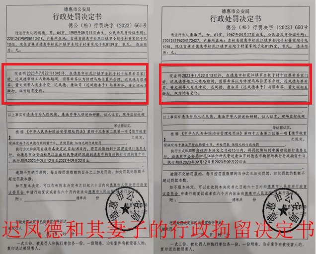 但是,事件发生一个多月后,不知道是何原因,案情居然发生了惊天的逆转,警方又做出了对迟凤德夫妻的拘留决定书,并且在对迟凤德夫妇的拘留决定书中,对此案案情做了截然相反的描述:“现查明,2023年7月22日13时许,在德惠市松花江镇罗全坨子村十组蔡希芬家门前,迟凤德带领工人修路期间,因蔡希芬认为修理马路位置不合理,迟凤德与蔡希芬、董文娟等人发生冲突,迟凤德、康淑芹(迟凤德妻子)与蔡希芬、董文娟相互撕打,双方均有受伤。”