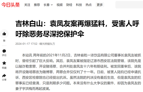 本站讯 两年前的2021年11月2日,吉林省乾一浓饮品有限公司董事长袁凤友被抓时,曾经引起了巨大反响。其后,袁凤友案被指定辽源市西安区法院管辖,该院先是以敲诈勒索罪、开设赌场罪,合并判处袁凤友十六年有期徒刑。被发回重审后,该院将开设赌场罪改为赌博罪,两罪合并仅仅判了十一年。日前,被害人陆钧已经申请抗诉,西安区检察院也已经提出抗诉。虽然法院的判决没有最后生效,但是袁凤友的犯罪事实已经查清,只是刑期多少问题。本来没有什么大争议的案件,却因为袁凤友的妻子宇洪梅而再起波澜。