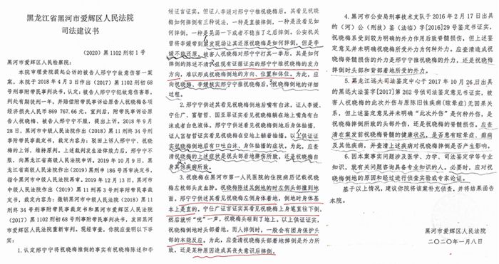 邢宁宁依旧不服,遂向黑龙江省高级法院申诉。省高院于2019年10月9日作出(2019)黑刑申186号再审决定,称:“原判据以定罪的证据不确实、不充分”,指令黑河市中级法院另行组成合议庭对本案进行再审。2019年12月13日,黑河中院作出(2019)黑11刑再3号刑事附带民事裁定,该裁定称:“本院认为,本案原一审、二审据以定罪的案件事实不清,证据不确实、不充分,不能排除合理怀疑”,裁定撤销了本院的(2018)黑11刑终34号刑事附带民事裁定和爱辉区法院(2017)黑1102刑初68号刑事附带民事判决,发回爱辉区法院重新审判。