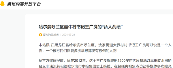 据官方媒体报道,早在2012年,这个王广良就曾把1200多亩优质耕地以旱田改水田的名义非法流转租给哈尔滨市水投集团卖土换钱。在包括央视焦点访谈等媒体多次曝光后,有关部门经调查,对涉案的30多名党政干部和水投集团人员进行了处理,其中10多人被追究了刑事责任,而王广良只是受到党内警告处分,之后又东山再起重新担任村书记。2024年7月1日以后,大罗村村民们再次举报其将5000亩承包地私自改成村集体机动地,将4700多万元补偿款长期扣押。对此,官方回应称,呼兰区纪委已经立案,可是半个月过去了,王广良依然嚣张跋扈如故!人们不禁惊呼,这个村书记到底有什么强大的靠山?难道他不断作恶,就没有人来管了不成?