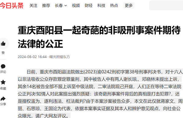 任何公民遭遇不公时维护自己的合法权益都是完全正当的,维权的过程就是促进法制进步的过程,也是对公职人员履行职责是否正确的监督。酉阳县法院(2023)渝0242刑初字第38号刑事判决书对十六名被告以非法吸收公众存款罪定罪量刑,众多旁听群众质疑其中存在人为徇私枉法干预,并且痕迹明显。媒体现将所有事情公之于众,恳请上级领导部门重视并介入,勇于纠错、敢于担责,排除当地阻力和干扰,公正、公平处理好此次事件,以维护司法的公正形象,维护社会的公平正义!让此案在法律上得到公正、公平的判决。对于此事,媒体将继续关注。(记者斗硬)