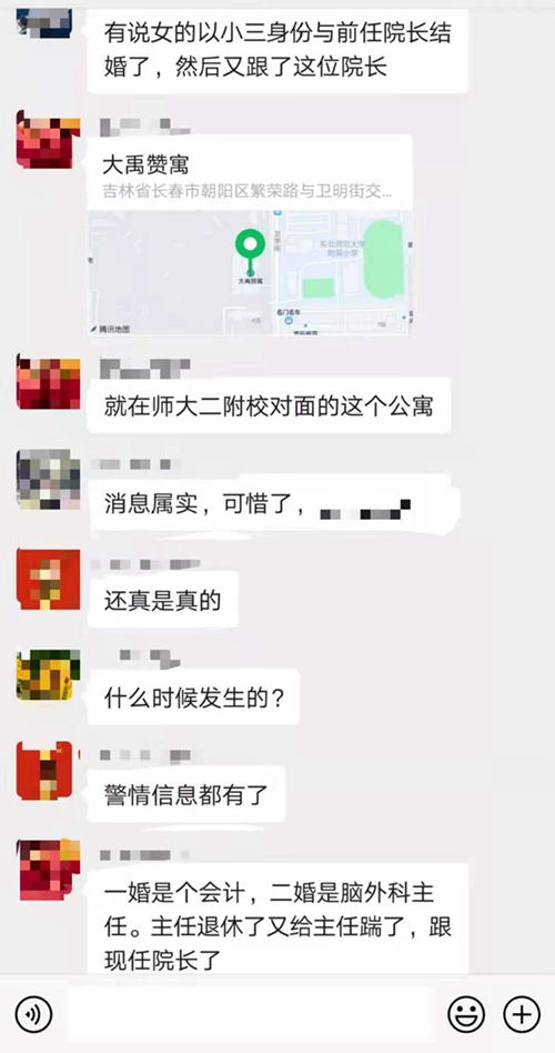 另一位网友“Gajiu”爆料更多案件细节:“吉大三院院长刘天戟,被护理部副主任兼护士长抹了脖子,俩人都是74年的,业务骨干,死的时候赤身裸体,死之前还啪啪啪,喝了一瓶茅台加6瓶啤酒,女方把男方抹脖子了,然后捅了十几刀,然后自己跳楼了。”