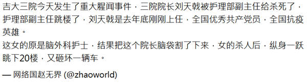 11月10日,网友“网络国赵无界”在网上爆料,吉林大学中日联谊医院发生重大凶杀案,院长刘天戟被护理部副主任给杀死了。护理部副主任跳楼了。刘天戟是去年底刚刚上任院长的。这女的原是脑外科护士,结果把这个院长脑袋割了下来,女的杀人后,纵身一跃眺下20楼,又砸坏一辆车。