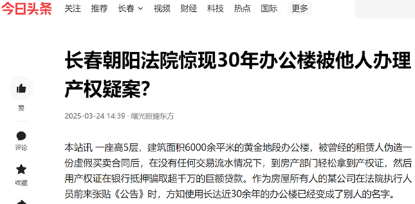 本站讯 一座高5层,建筑面积6000余平米的黄金地段办公楼,被曾经的租赁人伪造一份虚假买卖合同后,在没有任何交易流水情况下,到房产部门轻松拿到产权证,然后用产权证在银行抵押骗取超千万的巨额贷款。作为房屋所有人的某公司在法院执行人员前来张贴《公告》时,方知使用长达近30余年的办公楼已经变成了别人的名字。