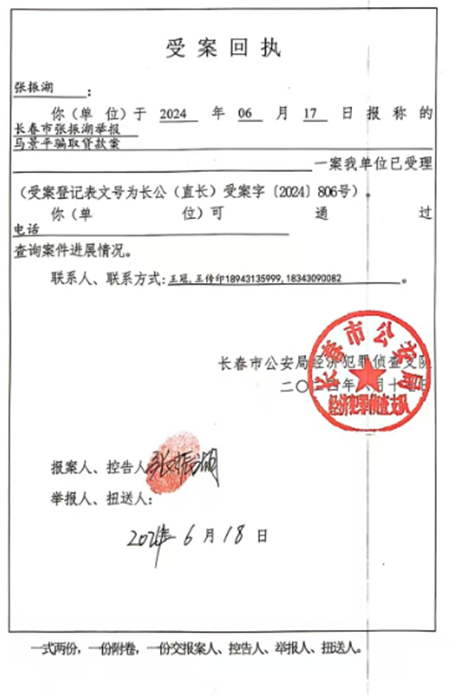 2024年6月18日,大通公司张总带着涉案房屋的多份购房协议书和交款发票等关键证据,向长春市公安局经济犯罪侦查支队报警。经侦支队接警后,非常重视,在认真查看了大通股份公司提交的报案材料后认为马景平已经涉嫌构成诈骗罪,表示会尽快立案调查,并向张总出具了《受案回执》。