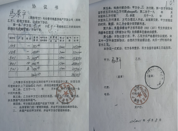 通过当地档案馆调取的马景平与银星开发公司签订的《协议书》可以看到,该协议的落款时间是2001年4月8日。内容为:甲方马景平与乙方长春市银星房地产开发公司达成协议,甲方购买乙方砖混结构新建住宅商服一套,1至5层,一二层售价每平米3000元,三四五层售价每平米1300元,落款日期为2001年4月8日。
