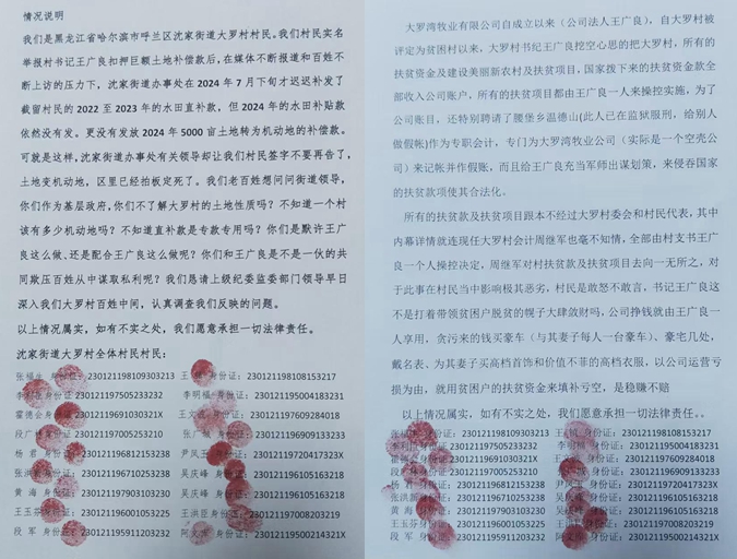 8月初,大罗村村民们再次向媒体反映:在媒体不断报道、百姓不断上访和上级纪检机关的压力下,沈家街道办事处终于补发了截留大罗村村民的2022和2023年的粮补款,但是2024年的依然没有发,更没有发放2024年的4700万占地补偿款。即使是这样,沈家街道办事处个别领导却让村民签息访协议不要在告了,并称土地变成机动地区里已经拍板定死了。然而,大罗村村民们想问问街道办领导,为什么被王广良扣押的4700万元占地补偿款至今仍不发放?扣押巨额直补款是否已经构成犯罪?为什么至今不予查处?王广良动不动就参与豪赌,其赌资是从哪里来的?是否是动用了应该发放给村民们的直补款?其扣押巨额直补款和豪赌都涉嫌犯罪,为什么至今不予查处?难道沈家街道的领导们和王广良是一伙的吗?我们恳请上级纪检、监察机构严查,给老百姓一个明确的交代!